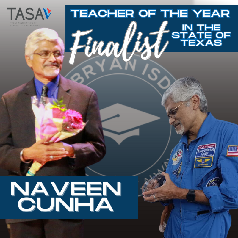 This belief could not be more evident in the way he interacts, teaches and inspires students daily in Bryan ISD. Already named the Region 6 Teacher of the Year for 2024, we are proud to have Naveen Cunha on staff and representing Bryan ISD as a finalist for the Texas Teacher of the Year!